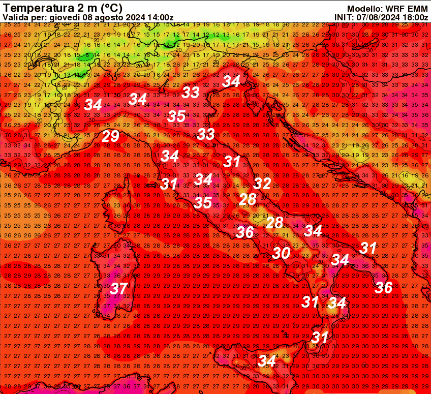 Punte di 37° sulla Sardegna e 36° nel Lazio e sulla Lucania. Altrove valori in lieve e temporaneo calo rispetto a ieri, ma sempre elevati. Questo è il DISAGIO da CALDO atteso in Italia nella giornata odierna.