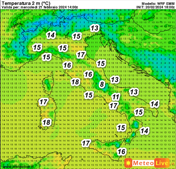 Come anticipato, nessun cambiamento sostanziale nel quadro termico, con valori molto miti da nord a sud. Punte di 17-18° al sud e sulle Isole.