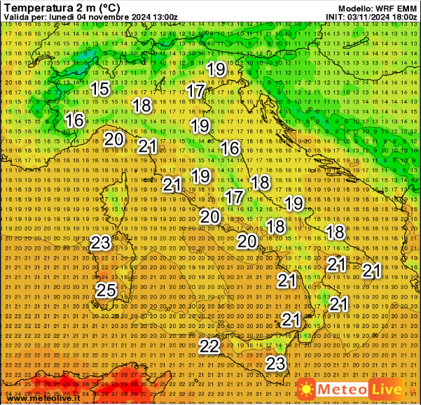 Estate in Sardegna con punte di 25°; 22-23° sulla Sicilia, 20-21° lungo il versante tirrenico e in Liguria.