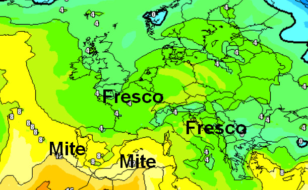 Sul fronte delle temperature, arriverà in Europa aria decisamente più fresca, ma non fredda. La seconda mappa mostra le temperature a 1500 metri attese in Europa nella medesima giornata, ovvero martedi 12 novembre: