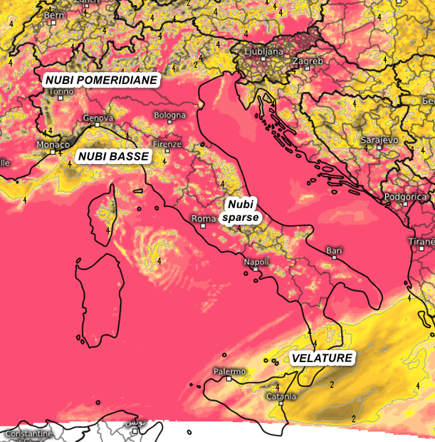 Infine, questo è il soleggiamento totale cumulato previsto tra le 9 e le 16 di mercoledi 5 giugno (rosa molto soleggiato, giallo nubi e schiarite, grigio scuro assenza di sole):