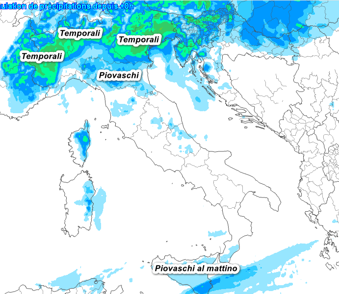 Mattinata con nubi sparse al nord e qualche pioggia sul Piemonte e brevi pioviggini in Liguria. Piovaschi a base alta in Sicilia, ma in via di attenuazione. Nel pomeriggio formazione di temporali sui rilievi alpini e prealpini, in sconfinamento serale sulle pianure di Piemonte, nord Lombardia e Triveneto. Qualche piovasco o breve temporale sarà possibile nel pomeriggio anche sull’Appennino settentrionale, per il resto tempo asciutto.