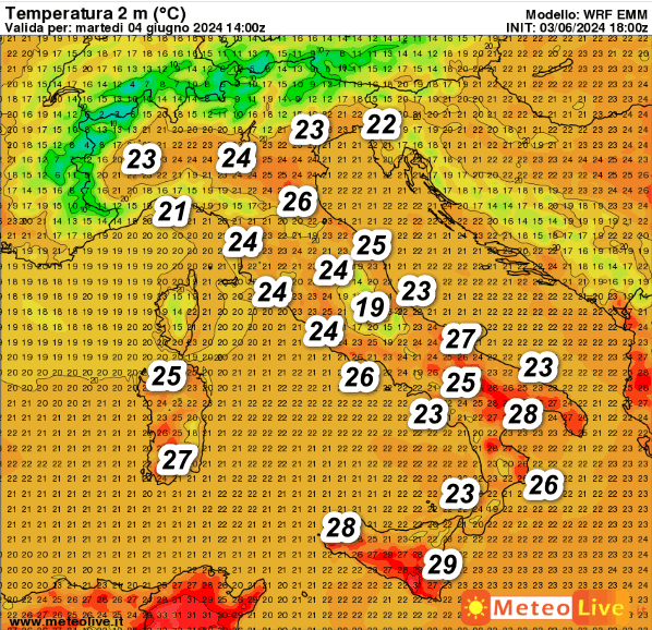 Valori nel complesso gradevoli su tutta l’Italia. Segnaliamo punte di 29° in Sicilia e 28° sulla Lucania.