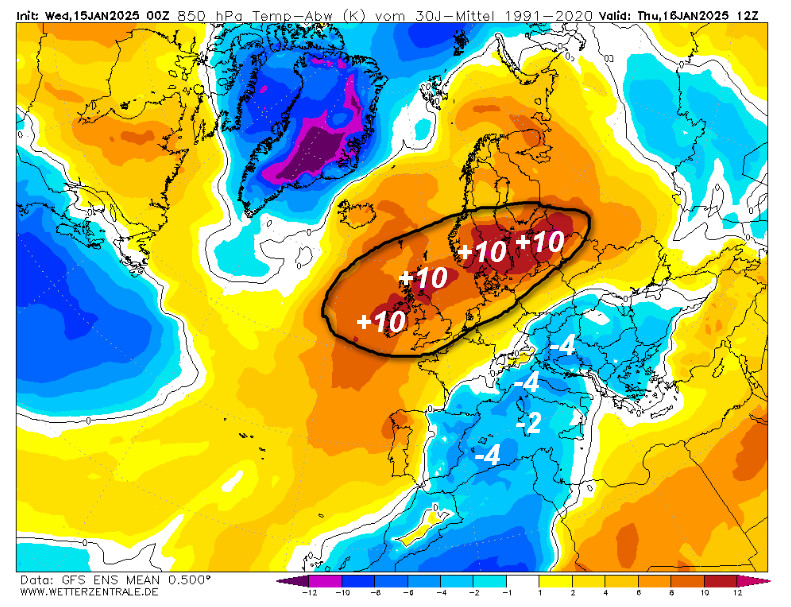 La seconda mappa mostra le anomalie termiche alla medesima quota (1500 metri) previste in Europa nelle ore centrali di giovedi 16 gennaio: