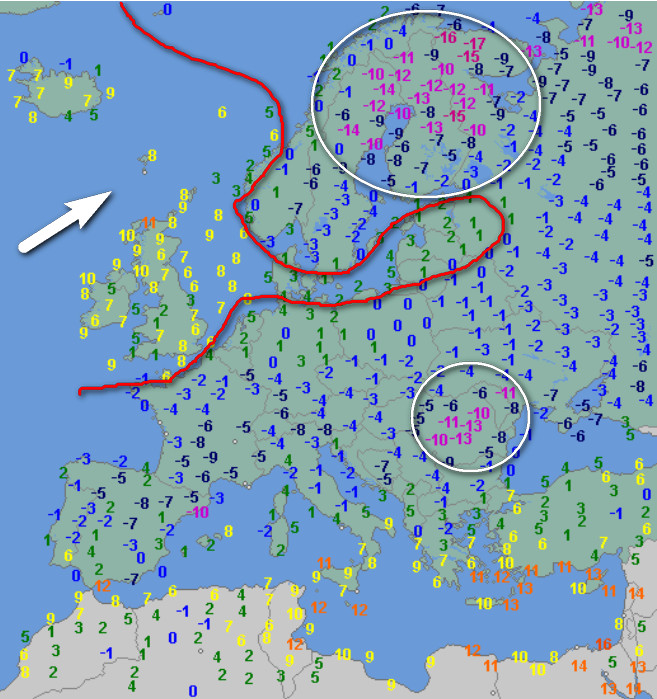 Guardate cosa sta combinando il nostro anticiclone. Notiamo quasi tutto il Continente alle prese con temperature negative, anche pesantemente nelle aree cerchiate in bianco. Temperature tra -6 e -8° persino nel cuore della Francia e sulla Penisola Iberica. Fanno eccezione le Isole Britanniche esposte ad un flusso umido da sud-ovest, con valori termici anche superiori a 10° in piena notte. Non fa freddo nemmeno in Islanda dove le temperature notturne ampiamente positive.