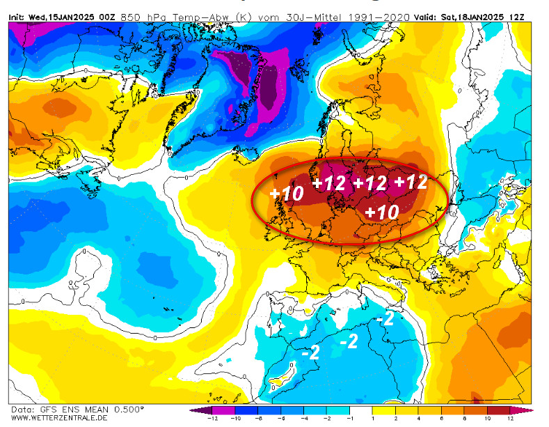Infine, queste sono le anomalie termiche a 1500 metri previste in Europa per la giornata di sabato 18 gennaio: