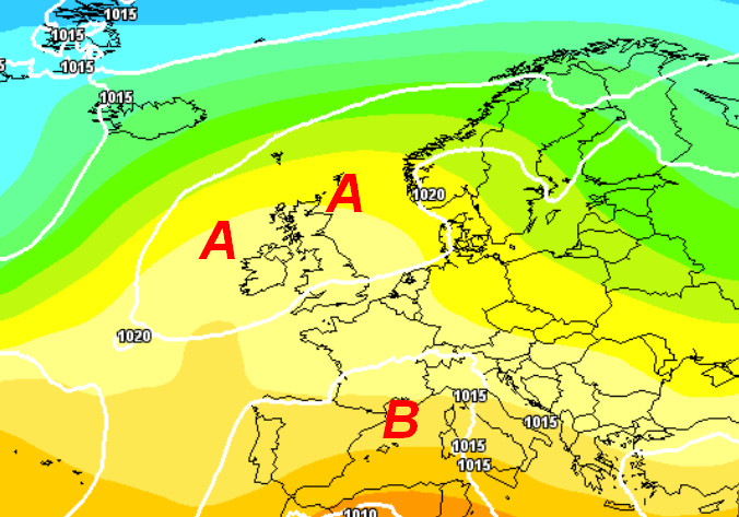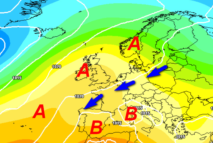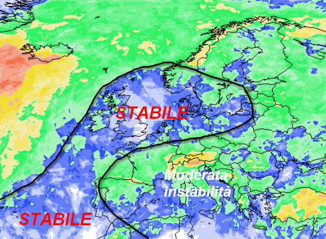 Osservate il lungo ponte anticiclonico che dal vicino Atlantico si allungherà sull’Europa settentrionale passando per le Isole Britanniche. Qui avremo un tempo stabile, soleggiato e molto mite. Se osservate invece il bacino del Mediterraneo e l’Italia, noterete una blanda circolazione depressionaria foriera di tempo instabile dalle nostre parti.