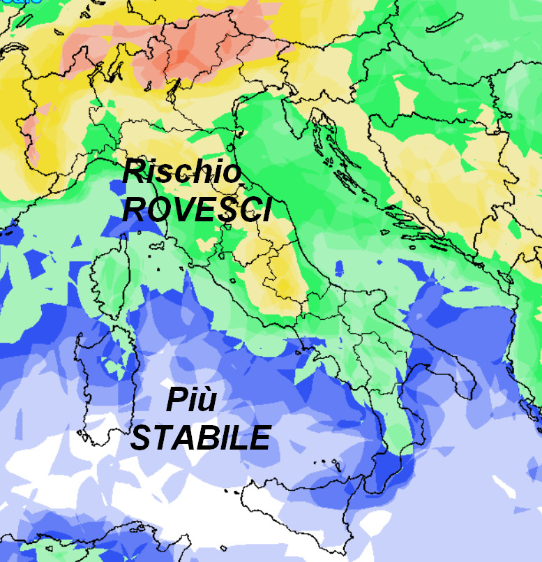 L’area con probabilità di pioggia bassa o nulla è la traccia dell’alta pressione, che come vedete sarà ubicata troppo a nord per interessare l’Italia ed il Mediterraneo. Da noi vigeranno condizioni di instabilità dettate da una probabilità di pioggia anche elevata dove vedete il colore tendente al giallo-arancione. Come già anticipato, non arriveranno piogge estese e persistenti, ma il tempo non sarà ancora “stabile” specie al centro-nord e nelle aree interne in genere; qui si produrranno con maggiore facilità rovesci e temporali principalmente nelle ore pomeridiane e serali e e soprattutto nelle zone montuose e nelle pianure adiacenti.