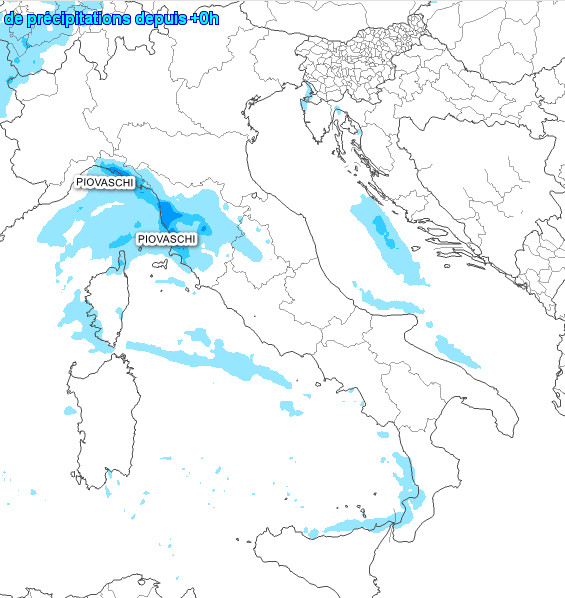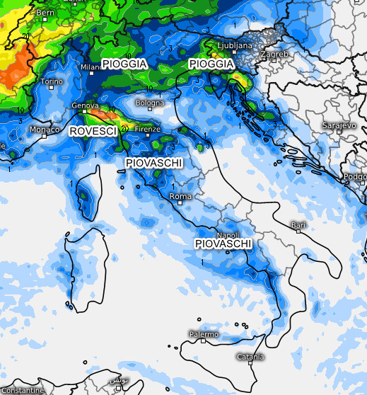 Rovesci sulla Liguria centro-orientale e piogge su gran parte del settentrione ad eccezione di Piemonte, Ponente Ligure ed Emilia Romagna. Neve sulle Alpi inizialmente oltre i 1200-1300 metri, ma in calo dalla sera fino a 700-800 metri. Rovesci anche sulla Toscana e piovaschi sparsi sul Tirreno fino alla Campania, per il resto tempo asciutto. Rinforzo dei venti di Libeccio sui mari occidentali italiani, temperature in calo dalla sera al nord, stazionarie su valori ancora miti sul resto d’Italia.