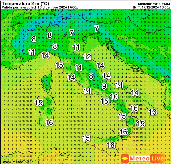 Nessun cambiamento sostanziale negli assetti termici in Italia rispetto alla giornata di ieri. Un po’ freddo sulle pianure del nord specie sotto nebbia, per il resto valori miti, con punte di 18° sulla Sicilia.