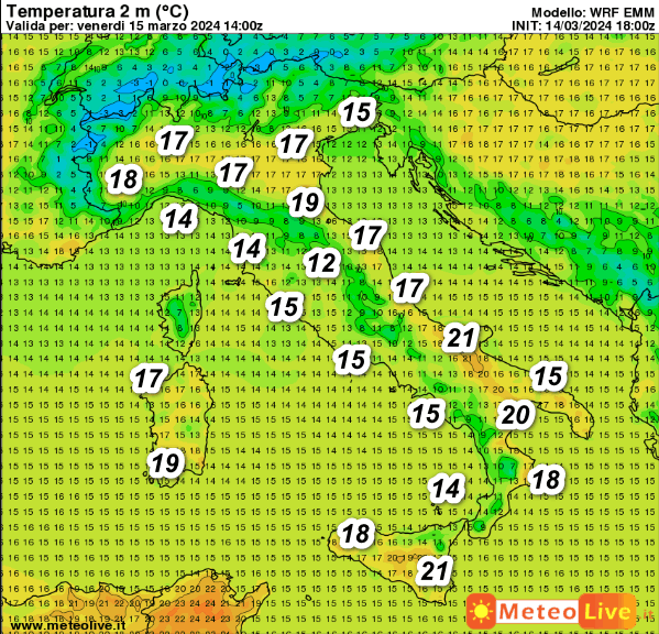 Punte di 20-21° su Sicilia, Puglia e Lucania. Temperature più fresche tra Liguria, Appennino settentrionale ed alto Tirreno.