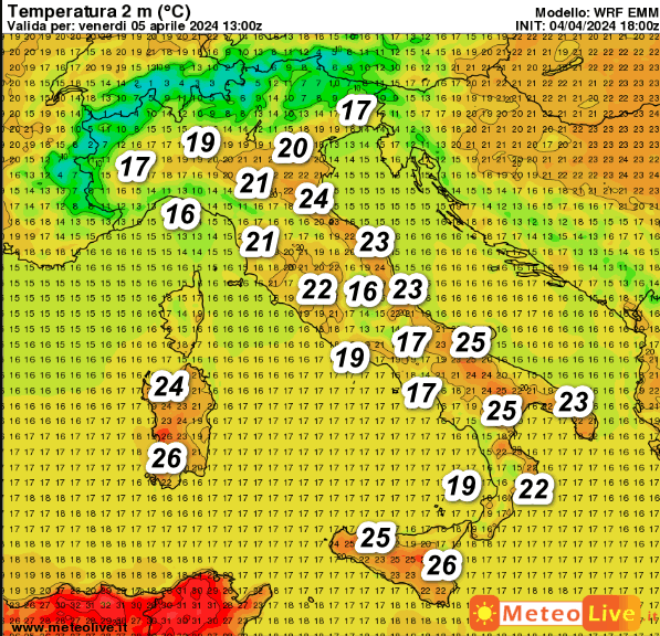Ritroviamo punte di 26° sulla Sardegna e sulla Sicilia, 25° sulla Lucania e sulla Puglia, 24° sulla Romagna. Per il resto temperature abbastanza gradevoli.