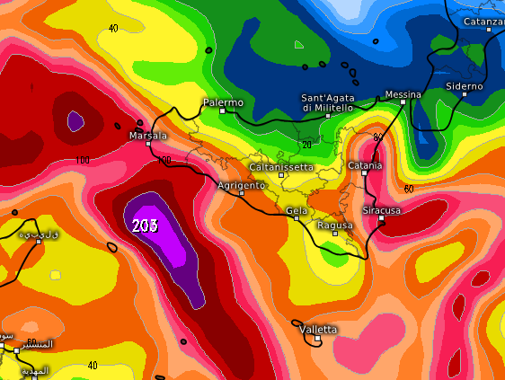 Notate gli accumuli preoccupanti previsti tra il 14 e il 15 ottobre tra il Nuorese e l’Ogliastra in arrivo dal mare (colore viola), stessa situazione qui sotto prevista sulla Sicilia nello stesso intervallo temporale, qui rischiano Trapanese, Marsalese e Agrigentino, anche se gli accumuli più preoccupanti sembrerebbero rimanere in mare aperto:
