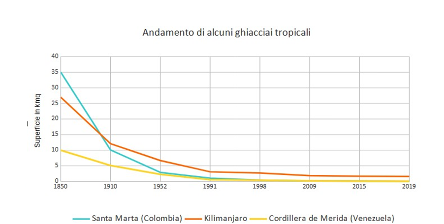 Ad aggiungere mistero all’inspiegabile, emerge il fatto che la maggior parte del ritiro dei ghiacciai è ascrivibile al periodo antecedente la seconda guerra mondiale, e solo una piccola parte è riconducibile agli ultimi decenni. In altre parole, buona parte del ghiacciaio del Kilimangiaro è scomparso prima che si iniziasse a parlare di riscaldamento globale, o che se ne apprezzassero altri effetti; ed ancora di più tale fenomeno è vero per altre montagne ghiacciate dei tropici, come la Sierra Nevada de Santa Marta in Colombia o la Cordillera de Merida in Venezuela (vedi grafico).