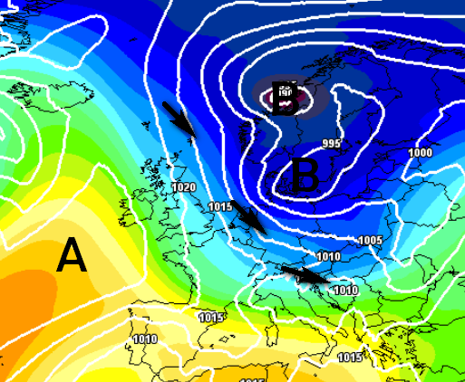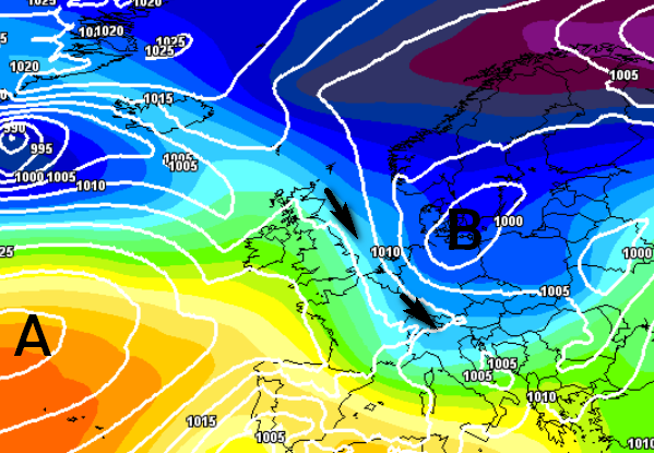 La configurazione barica prevista dal modello americano per la notte tra sabato e domenica è questa: