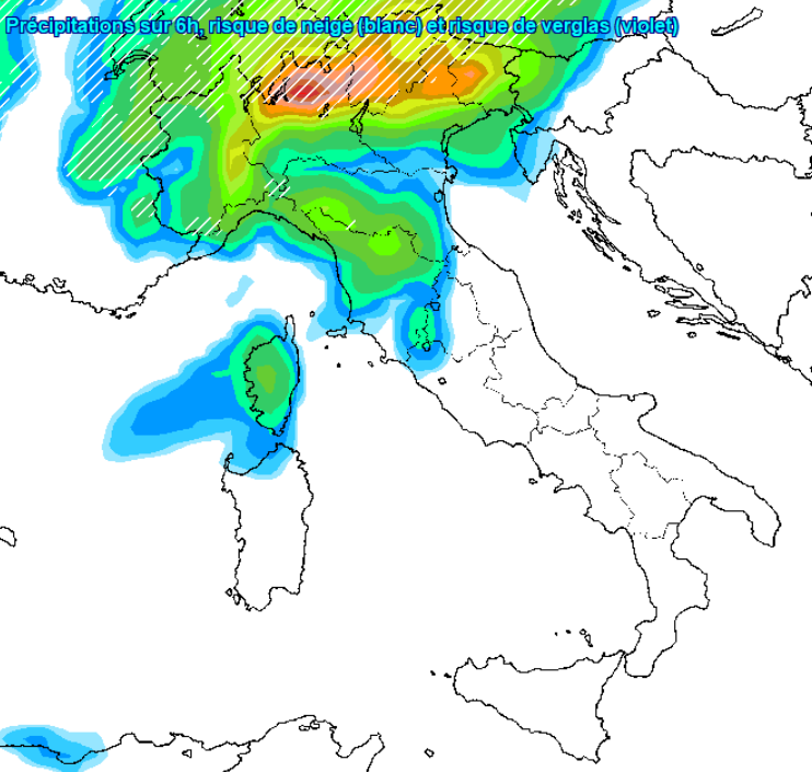 Ed ecco le conseguenze sul piano precipitativo nelle ore notturne tra sabato e domenica e nella prima mattinata, dove si notano le fitte nevicate sulle Alpi sin sotto i 1000m e i temporali probabili sulla Valpadana in movimento da ovest verso est: