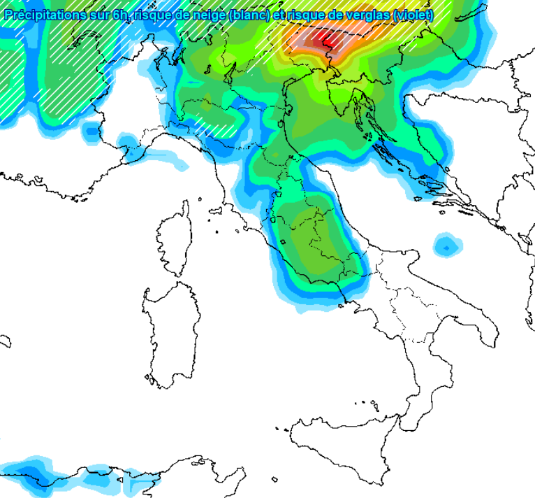 Un fronte freddo attraverserà in modo più o meno netto la Penisola, colpendo soprattutto le regioni adriatiche. Il modello che prevede i maggiori fenomeni è quello americano.