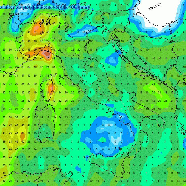 Vi ricordiamo che i colori tendenti al rosso evidenziano le piogge più intense, mentre i numeri sulle mappe sono i millimetri di pioggia previsti, che non devono essere presi come oro colato, ma servono solo a visionare le aree maggiormente colpite dalle precipitazioni.