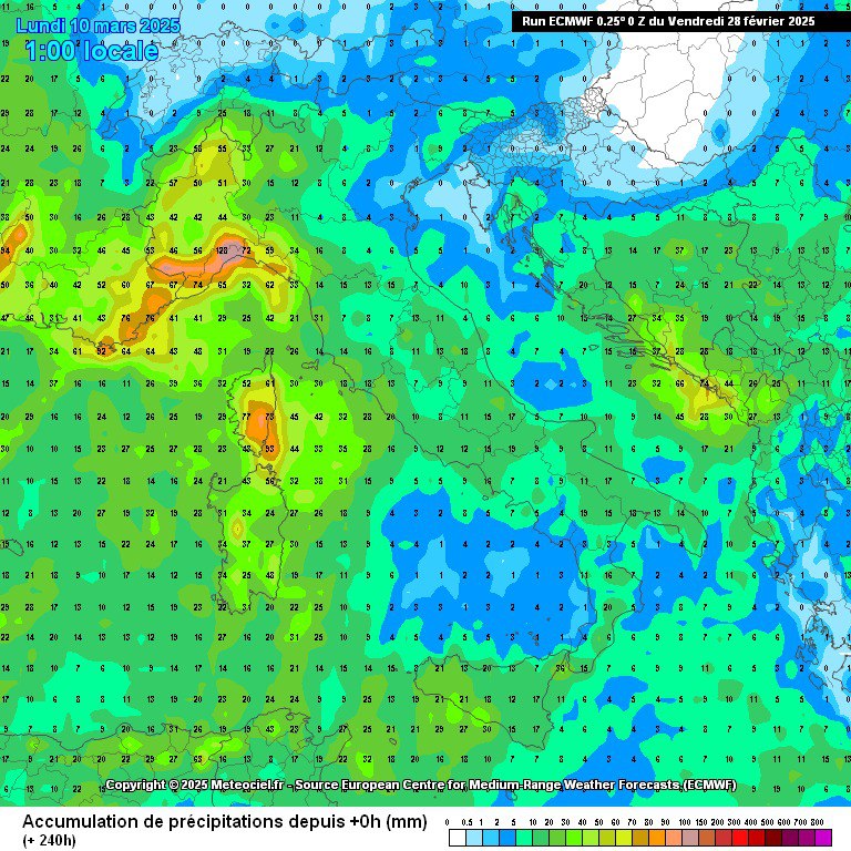 Questa invece è la sommatoria delle precipitazioni attese in Italia fino al 10 marzo, secondo il modello ECMWF:
