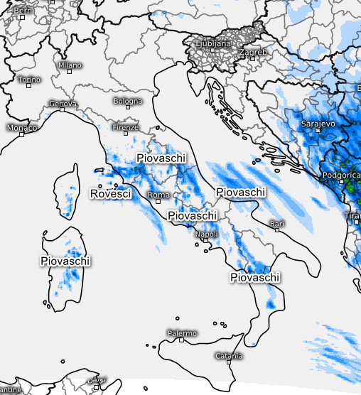 Al mattino piovaschi o rovesci sul Lazio, specie lungo le coste. Nel pomeriggio rovesci o piovaschi soprattutto tra bassa Toscana, Umbria, zone interne del Lazio e dell’Abruzzo. Nel tardo pomeriggio qualche rovescio raggiungerà anche la Campania, la Lucania e le aree interne della Sardegna. Fenomeni comunque locali, non continuativi ed alternati al sole. Situazione in generale miglioramento in serata, con cessazione delle piogge quasi ovunque.