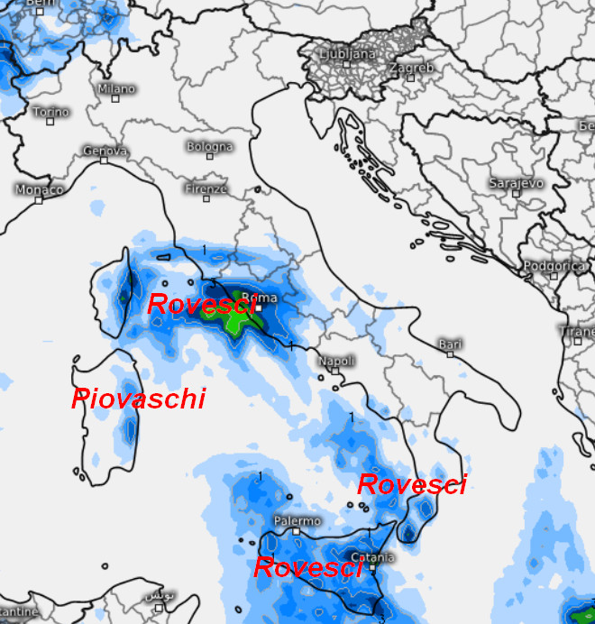 La terza cartina mostra la sommatoria delle precipitazioni attese in Italia nella giornata di venerdi 21 febbraio: