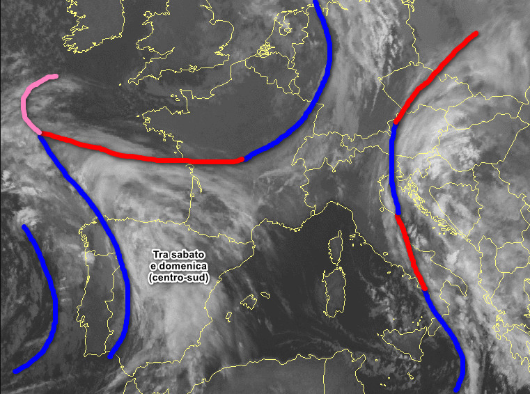 Ecco la prima perturbazione che si è arenata sulle nostre regioni meridionali, ma tenderà ad attenuarsi contro il muro anticiclonico presente più ad est. Sulla Penisola Iberica notiamo una seconda perturbazione che entrerà nel Mediterraneo e darà luogo ad un peggioramento del tempo nel week-end al centro-sud, con interessamento marginale anche del settentrione.