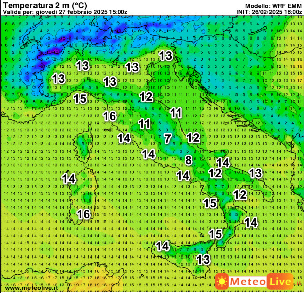 Sul fronte delle temperature, questi sono i valori attesi in Italia alle ore 16 di giovedi 27 febbraio: