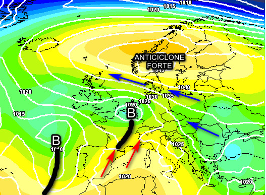 Abbiamo ancora un‘alta pressione molto forte in sede scandinava che obbliga le perturbazioni a passare abbastanza basse sull’Europa centrale e anche sull’Italia. Al momento individuiamo due perturbazioni nel complesso deboli; la prima, distesa sulla Francia orientale, interesserà il nord ed il centro soprattutto nella giornata di martedì, ma con piogge nel complesso deboli e intermittenti e quota neve abbastanza alta.
