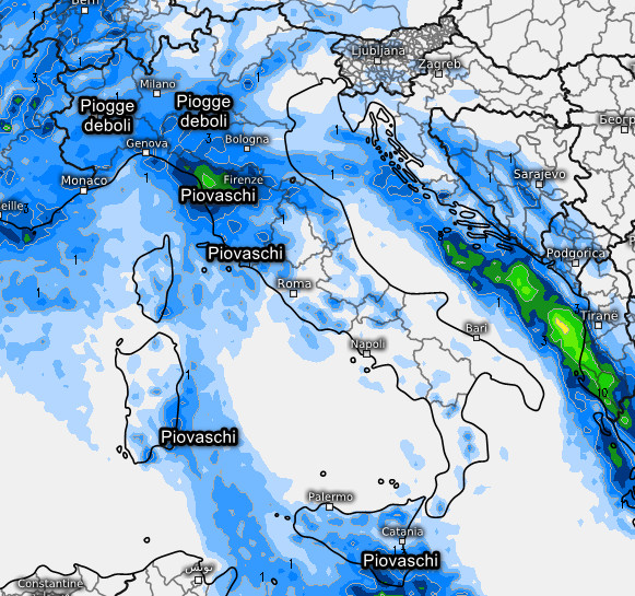 Piogge nel complesso deboli o pioviggini al nord-ovest più probabili nel pomeriggio-sera, rovesci invece a tratti intensi sulla Toscana nel pomeriggio-sera, specie fra Garfagnana, Lucca, Pistoia, Prato e Firenze. Quota neve tra i 1.000 ed i 1.300 metri sulle Alpi, 1.550-1.600m metri in prossimità dell’Appennino centro-settentrionale; fenomeni meno frequenti al nord-est. Piovaschi (ma previsione ancora incerta) anche sulla Sardegna sud-orientale, mentre quelli sulla Sicilia meridionale non trovano riscontro su altri modelli. Per il resto tempo asciutto, ma non completamente soleggiato. Clima nel complesso mite al centro e al sud, abbastanza freddo e umido al nord.