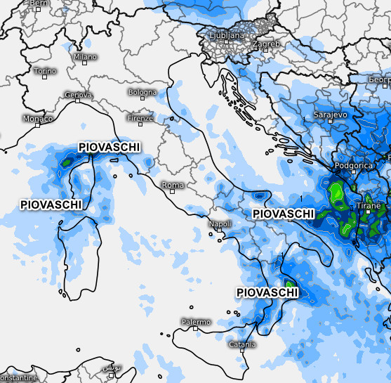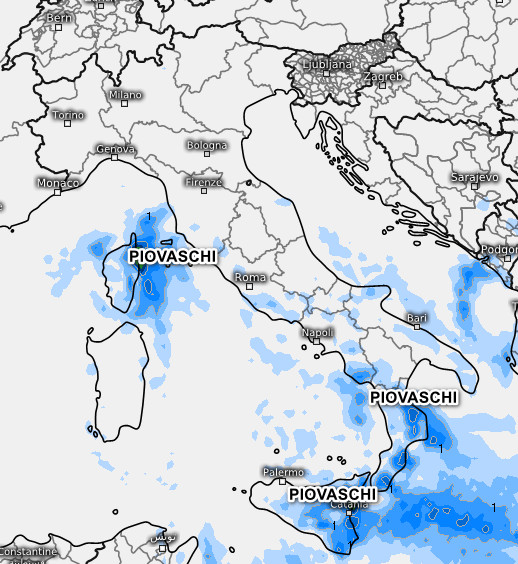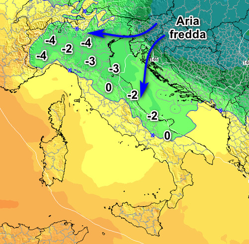 Isoterme alla medesima quota al di sotto dello zero saranno presenti al nord e lungo gran parte del versante adriatico con punte di -4° sulla verticale della Valpadana. Il contrasto tra la suddetta aria fredda e correnti più miti di matrice mediterranea causerà qualche DEBOLE E ISOLATA pioggia che interesserà segnatamente le Isole ed in parte il meridione.
