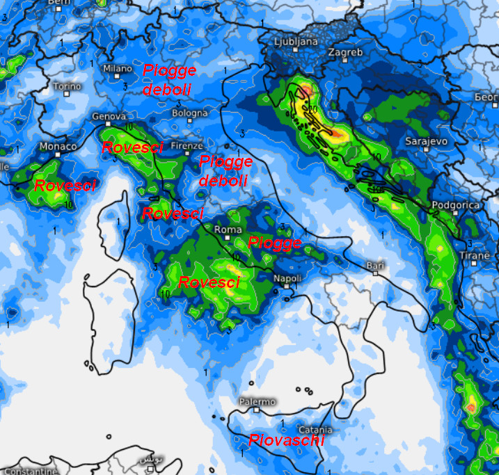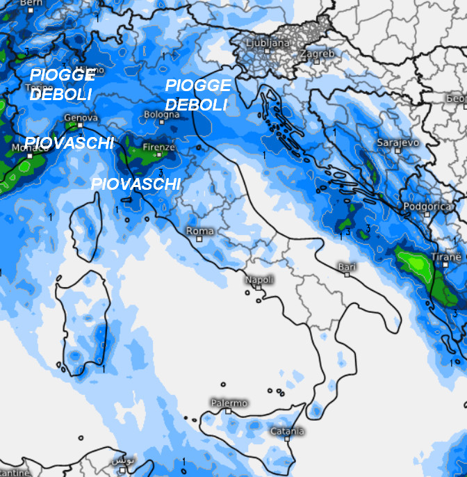 Piogge deboli sulle pianure del nord e nelle aree interne del centro, spesso sotto forma di pioviggine. Rovesci su Liguria, coste toscane e Lazio. Piogge deboli anche tra Abruzzo e Molise unitamente a piovaschi sulla Sicilia, per il resto tempo asciutto o con piogge poco probabili. Quota neve invariata sulle Alpi oltre i 1100-1200 metri ed oltre i 1400 metri in Appennino. Non farà eccessivamente freddo.