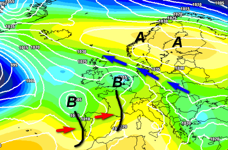 Iniziamo con la mappa sinottica attesa in Italia nelle ore centrali di martedi 12 febbraio: