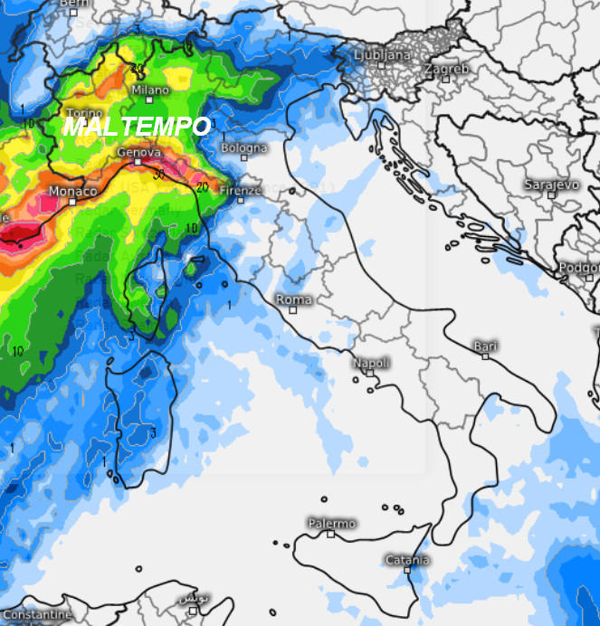Maltempo nel corso della giornata sul nord-ovest con piogge anche intense sulla Liguria, principalmente dal pomeriggio-sera. Qualche piovasco arriverà in serata anche sulla Sardegna e sulla Toscana, per il resto il tempo resterà asciutto e soleggiato. Il clima non sarà freddo, di conseguenza la neve si farà vedere solo sulle Alpi a quote di media montagna, oltre i 1.300-1.600 metri.