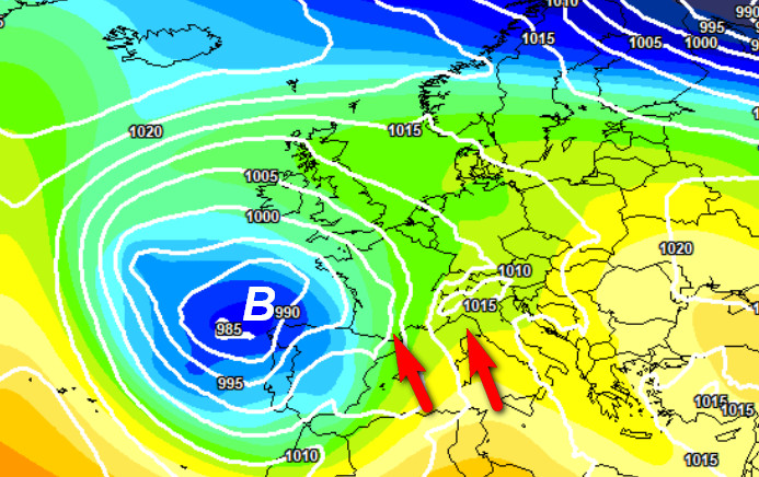 Correnti di Scirocco sull’Italia (frecce rosse) ad annunciare un peggioramento del tempo che sabato interesserà segnatamente le due Isole Maggiori e domenica gran parte del centro-nord, con piogge anche intense, specie del pomeriggio.