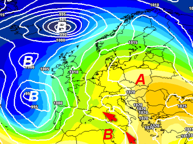 L’alta pressione porterà i suoi massimi verso levante. Da ovest si affaccerà una vasta e complessa depressione che protenderà un lembo verso il nord Africa. Il calo della pressione si farà sentire in un primo tempo sulle due Isole Maggiori che saranno raggiunte da correnti umide da sud-est foriere di piogge sparse e rovesci tra venerdi e sabato.