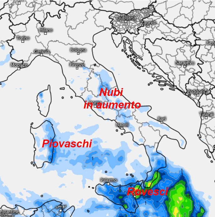 Maltempo sulla Sicilia e nel sud della Calabria con precipitazioni anche intense e temporali. Rovesci saranno presenti anche sulla Sardegna, specie i settori meridionali ed orientali. Su tutte le altre regioni il tempo si prevede ancora asciutto, anche se si farà vedere una maggiore nuvolosità in prevalenza medio-alta a scapito del sereno.