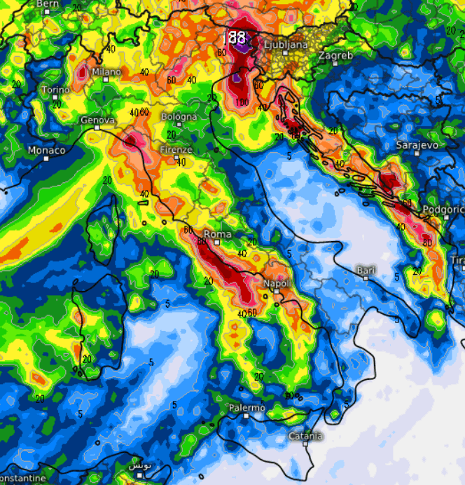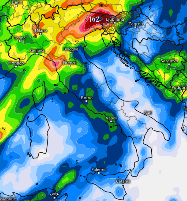 Partendo dal settentrione, questo elaborato pone piogge abbondanti su Spezzino e coste Toscane. Piogge molto abbondanti sul Friuli Venezia Giulia oltre all’alto Veneto e l’alta Lombardia. Piogge di un certo peso cadranno tra il Lazio e la Campania, mentre il versante adriatico e molte aree del meridione si troveranno in ombra pluviometrica, senza piogge importanti.