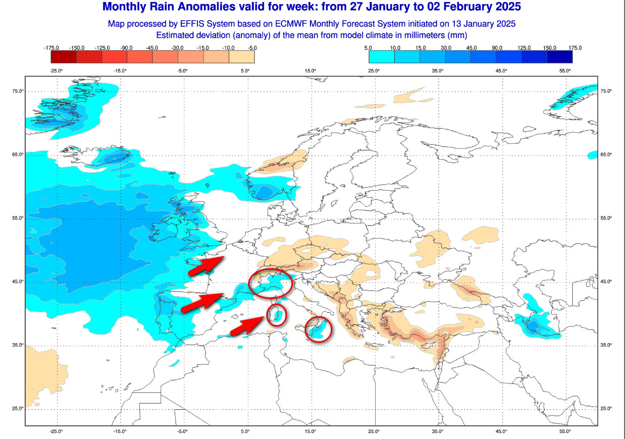 Quale sarà l’andamento delle piogge in Italia fino ai primi giorni di febbraio? Lo abbiamo chiesto al prestigioso centro di calcolo ECMWF che periodicamente elabora tendenze anche a lunghissimo termine. Tali mappe e le previsioni indicate, pur avendo una validità scientifica poichè effettivamente elaborate da potenti computer che eseguono miliardi di calcoli fisico-matematici basati anche su statistiche climatologiche, riteniamo non siano di utilità per programmare attività importanti.