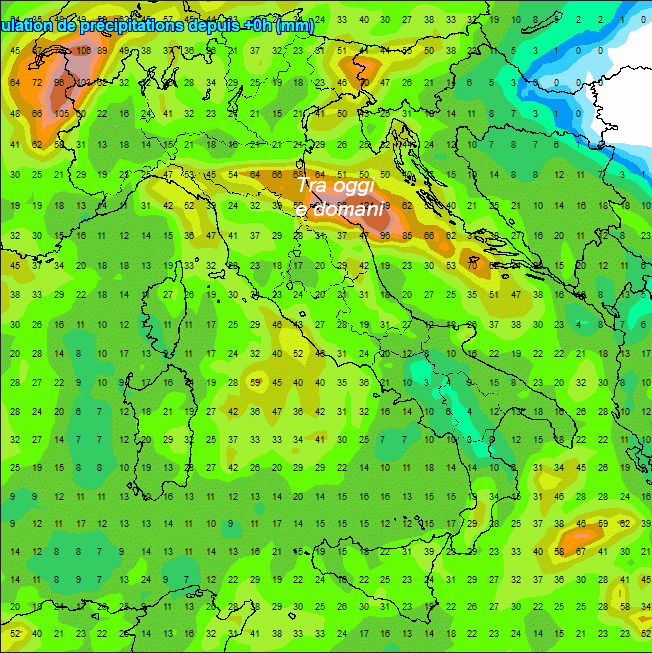 Piogge intense su Liguria centro-orientale, Val d’Aosta, nord Lombardia e Friuli. Piogge di un certo peso anche lungo il Tirreno e sulla Sardegna meridionale, altrove piogge meno intense e probabili.