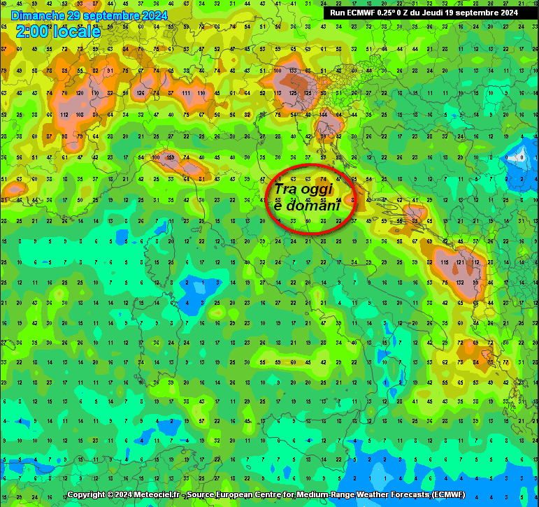 Ancora più chiara la disposizione delle piogge in Italia secondo il modello ECMWF, sempre fino a domenica 29 settembre: