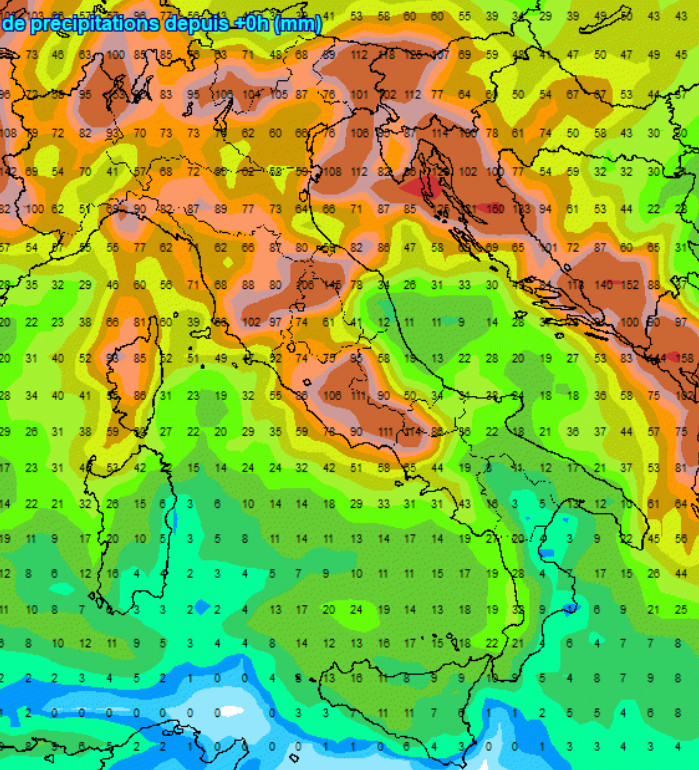 Regioni settentrionali e centrali sotto osservazione, in modo particolare il nord-est, Liguria, Toscana, Umbria e Lazio. Più scarse le piogge sul meridione peninsulare e sulla Sardegna, mentre la Sicilia, secondo questo elaborato, potrebbe non essere toccata da precipitazioni importanti.