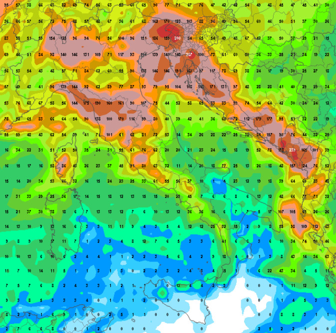 La prima mappa mostra la sommatoria delle piogge attese in Italia fino al 13 ottobre secondo il modello GFS. Vi ricordiamo che i numeri sono i millimetri di pioggia che non devono essere presi come oro colato, ma servono solo a scopo indicativo per inquadrare le aree maggiormente interessate.