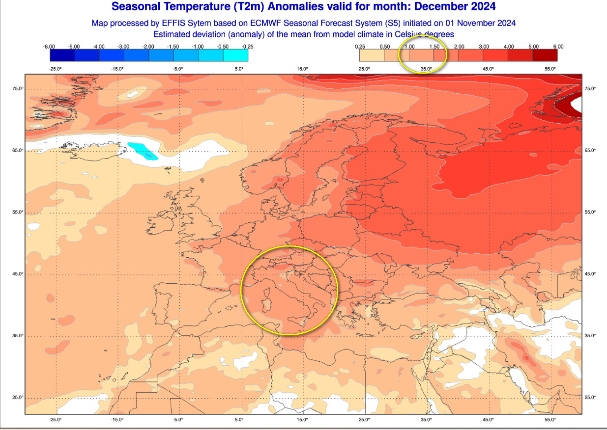 Secondo il modello in questione, sull’Italia (cerchiata in giallo) si prevede un sopra media termico compreso tra 1 ed 1.5°. Anomalie al rialzo più importanti sembrano probabili sui Paesi dell’Europa nord orientale e sulla vicina Russia dove gli esuberi potrebbero raggiungere i 4°.