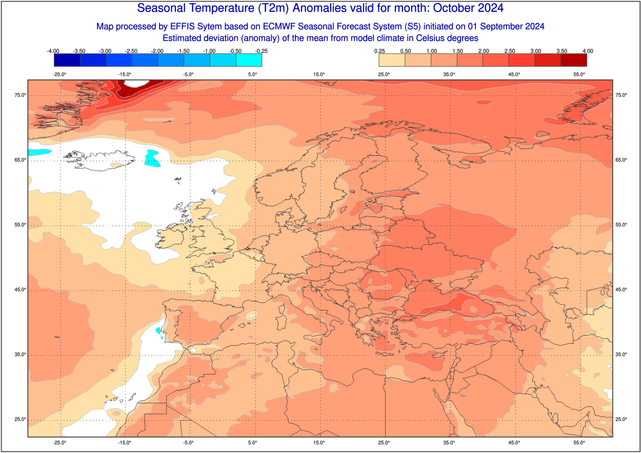 QUADRO TERMICO: la prima mappa mostra le anomalie termiche attese in Europa durante l’intero mese di ottobre:
