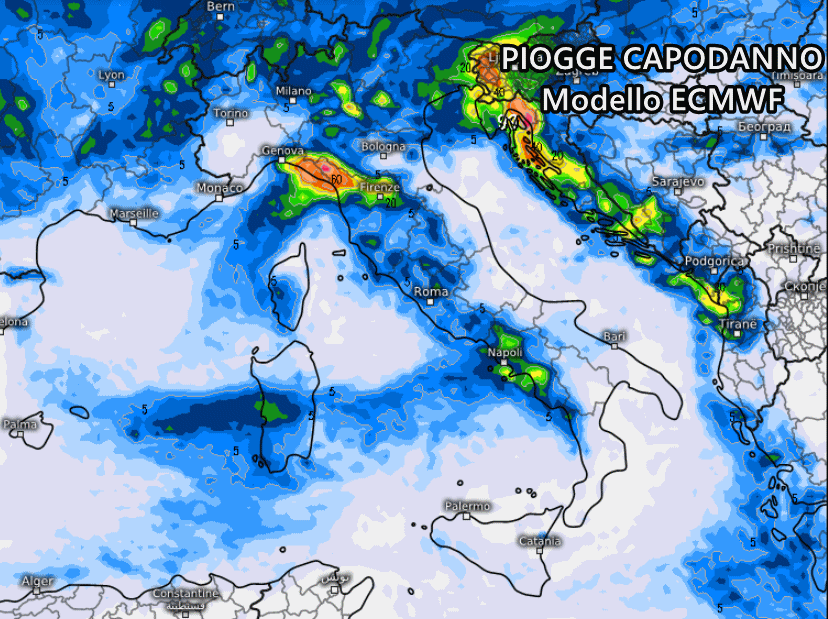 Anche il modello europeo ECMWF concorda con l’arrivo della pioggia, con accumuli esigui, tra 31 dicembre e 1° gennaio.
