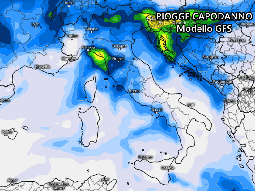 Nel giorno di Capodanno transiterà il fronte più organizzato, che porterà piogge su Liguria centro-orientale, Toscana e gran parte del nordest. Inoltre tra la notte e la mattina di Capodanno non escludiamo nevicate fino in alta collina sul Triveneto.