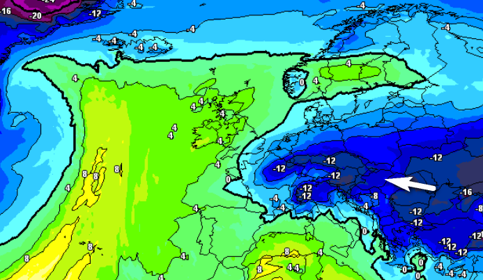 GROSSO: la mappa qui sopra è prevista per il week-end 22-23 febbraio e anche la massa gelida, pur avendo metà della sua potenza, potrebbe dir la sua portando isoterme di .-12°C a 1500m proprio sul nord Italia: