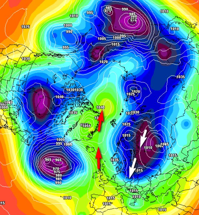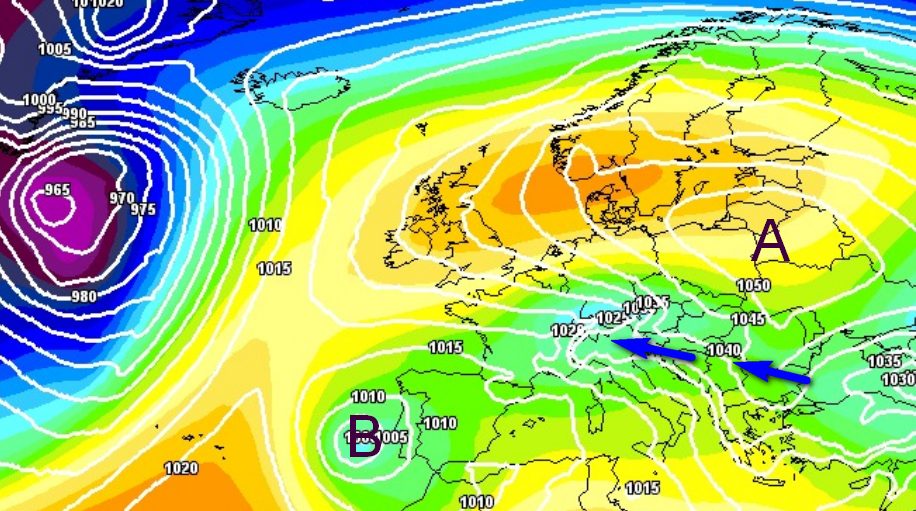 GROSSO: un blocco delle correnti occidentali favorito dalla risalita di un grosso promontorio anticiclonico dal nord Africa, che a differenza di quanto avviene solitamente, non rimarrebbe stabile a proteggere il Mediterraneo, ma si coricherebbe più a nord, lasciando dunque spazio a queste retrogressioni fredde da est proprio sull’Italia o su parte di essa.