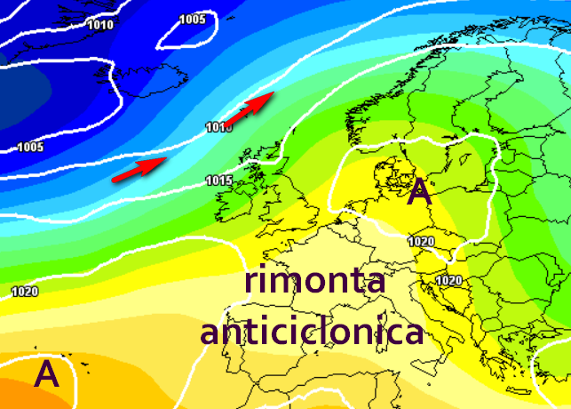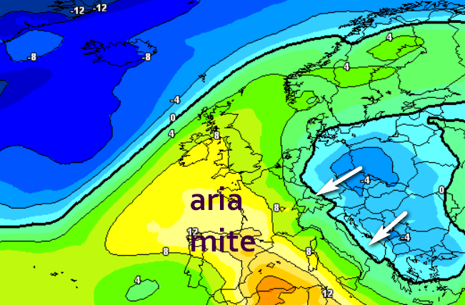 Tutto questo progetto freddo tardivo potrebbe però essere fortemente smorzato dalle ultimissime emissioni modellistiche, che nella media dei loro scenari non vedono affatto lo sfondamento del freddo da nord-est, bensì una rimonta dell’anticiclone a ridosso del Mediterraneo, in virtù di un moderato rinforzo della corrente a getto in Atlantico. Dunque il freddo verrebbe stoppato e l’Italia godrebbe di una fase bel tempo mite e piuttosto stabile, come si vede in questa mappa del modello GFS:
