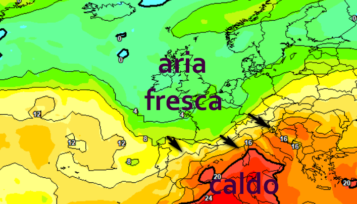 Guardate a livello termico come andrebbe a configurarsi la situazione quando l’aria fresca andrà ad impattare a ridosso delle Alpi, sfondando poi sul settentrione, siamo sempre al 4-5 giugno: